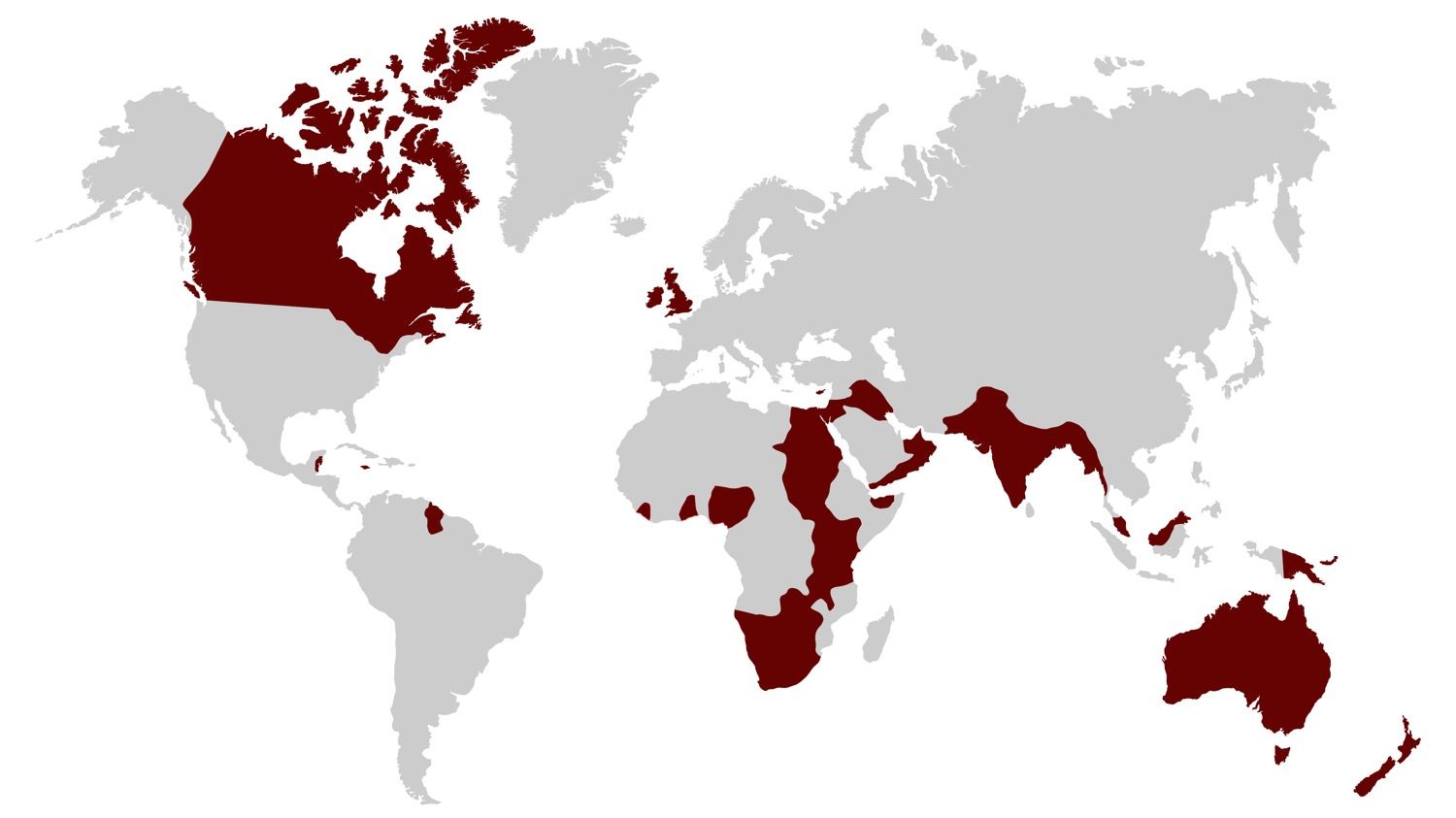 Each of the countries highlighted on this map are included in the British Empire, including one of our neighbors: Canada.